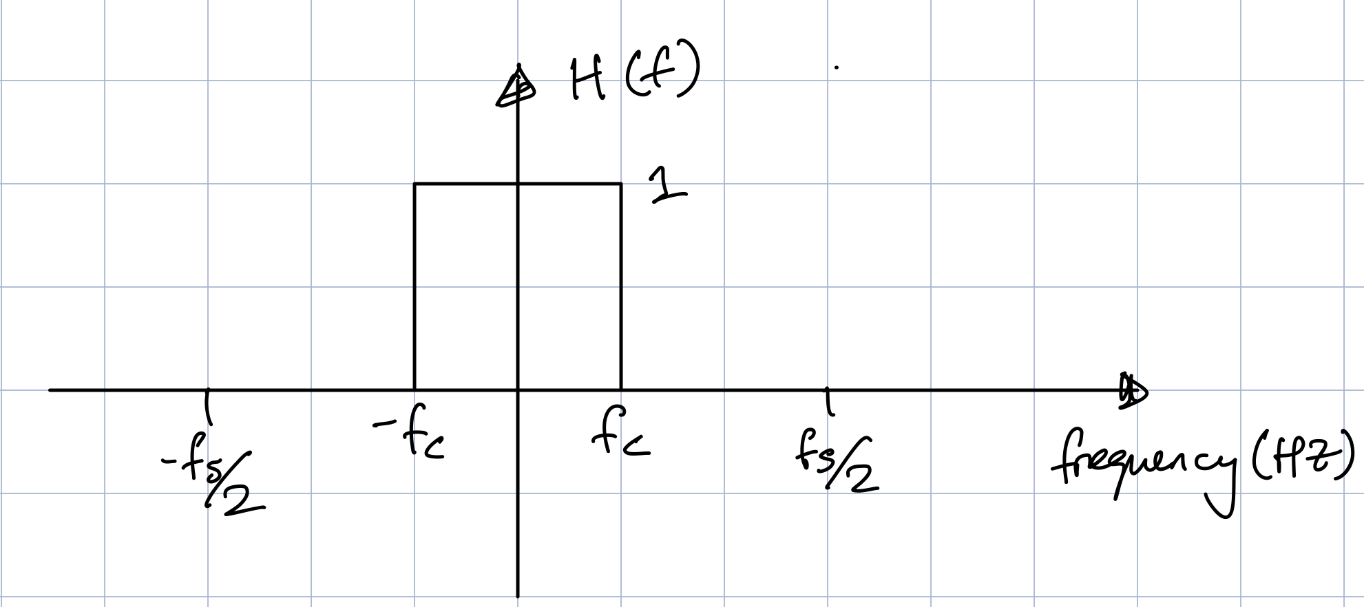 where \(f_{c}\) is the cut-off frequency in Hz, so that there is a “pass-band gain” of \(1\) between \(-f_{c}\) and \(f_{c}\), and zero elsewhere, hence preserving the frequency content up to the cut-off frequency (thus a low-pass filter). Note that we are considering the entire double-sided spectrum that is symmetrical around \(0\) Hz (see the DFT notebook for a refresher on this).