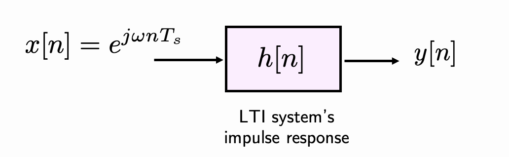 Let’s consider the LTI discrete-time system in Fig. 1 with impulse response, \(h[n]\) and a discrete-time complex exponential input \(x[n] = e^{j\omega n T_{s}}\), where \(\omega\) is the angular frequency (rad/s) and \(T_{s}\) is the sampling period (seconds).