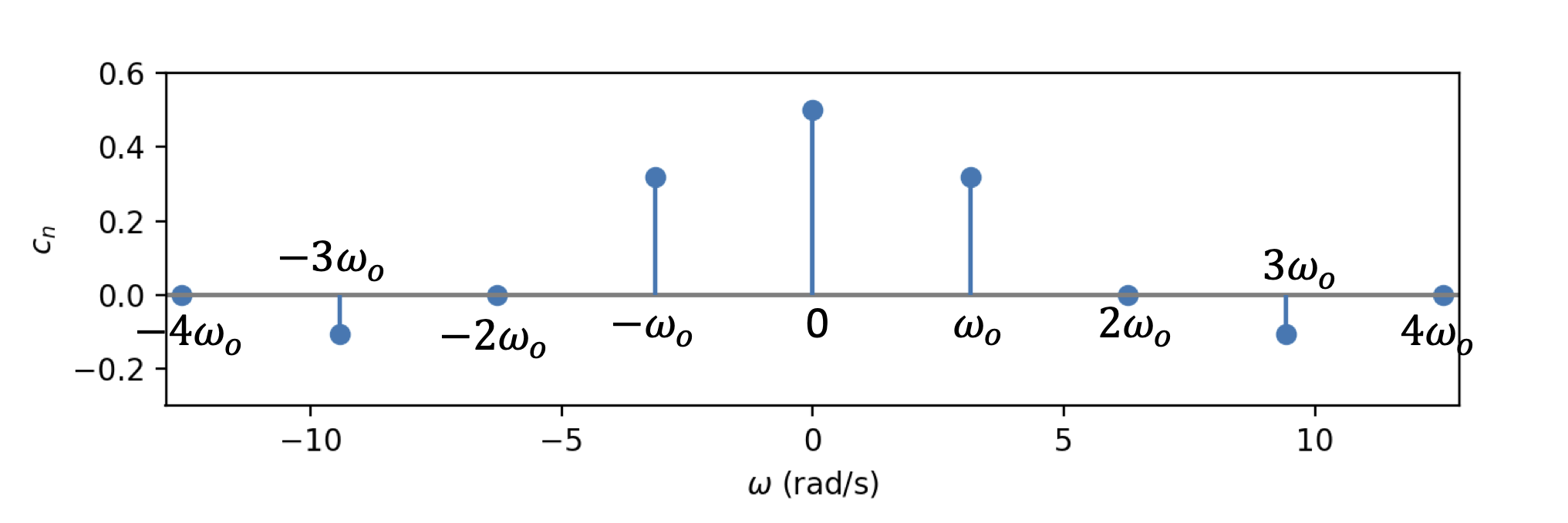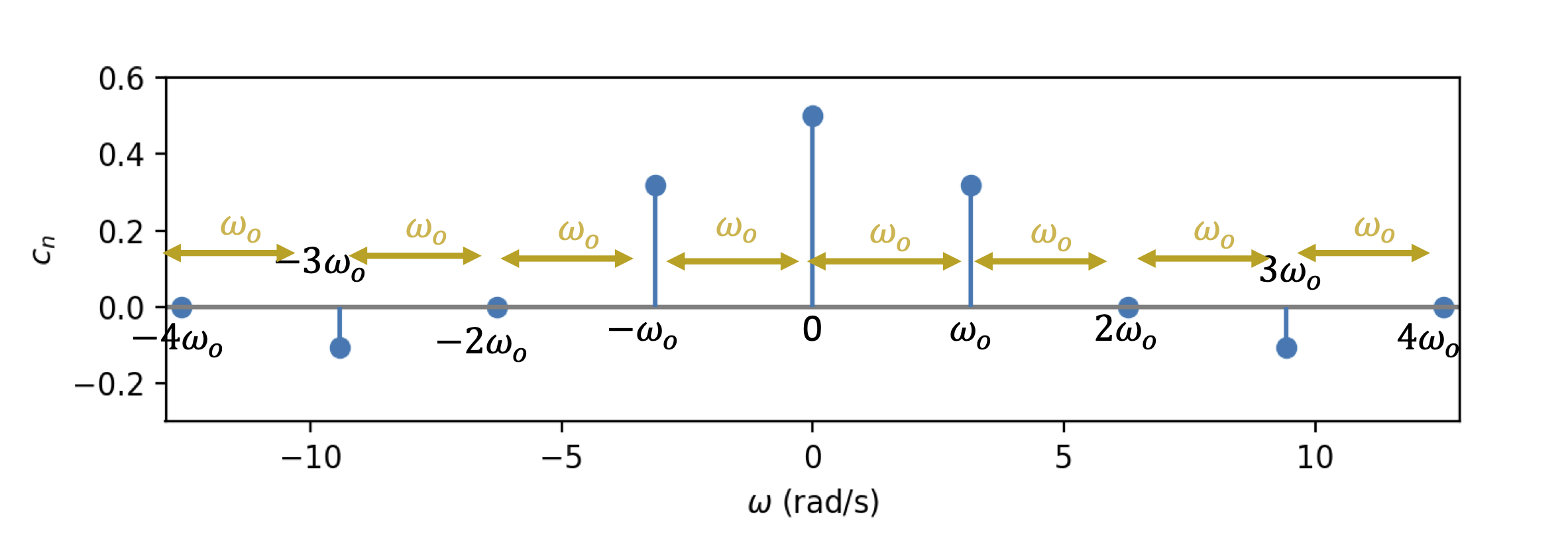The spectrum only consists of integer multiples of \(\omega_o\), i.e. \(n \omega_o\) for for \(n = 0, \pm 1, \pm 2, \dots \pm \infty\)